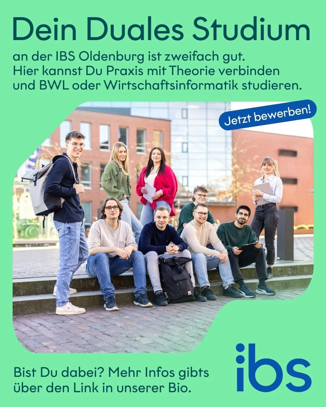 Die IBS IT & Business School Oldenburg bietet ein staatlich anerkanntes Duales Studium in BWL und Wirtschaftsinformatik an. Seit über 20 Jahren verbindet sie erstklassige Studienangebote mit praxisnaher Ausbildung in enger Zusammenarbeit mit renommierten Partnerunternehmen aus der Region. Die IBS Oldenburg legt besonderen Wert auf individuelle, persönliche Betreuung, Zukunftsorientierung und eine enge Verzahnung von Theorie und Praxis – und schafft so optimale Voraussetzungen für einen erfolgreichen Karrierestart ihrer Studierenden.