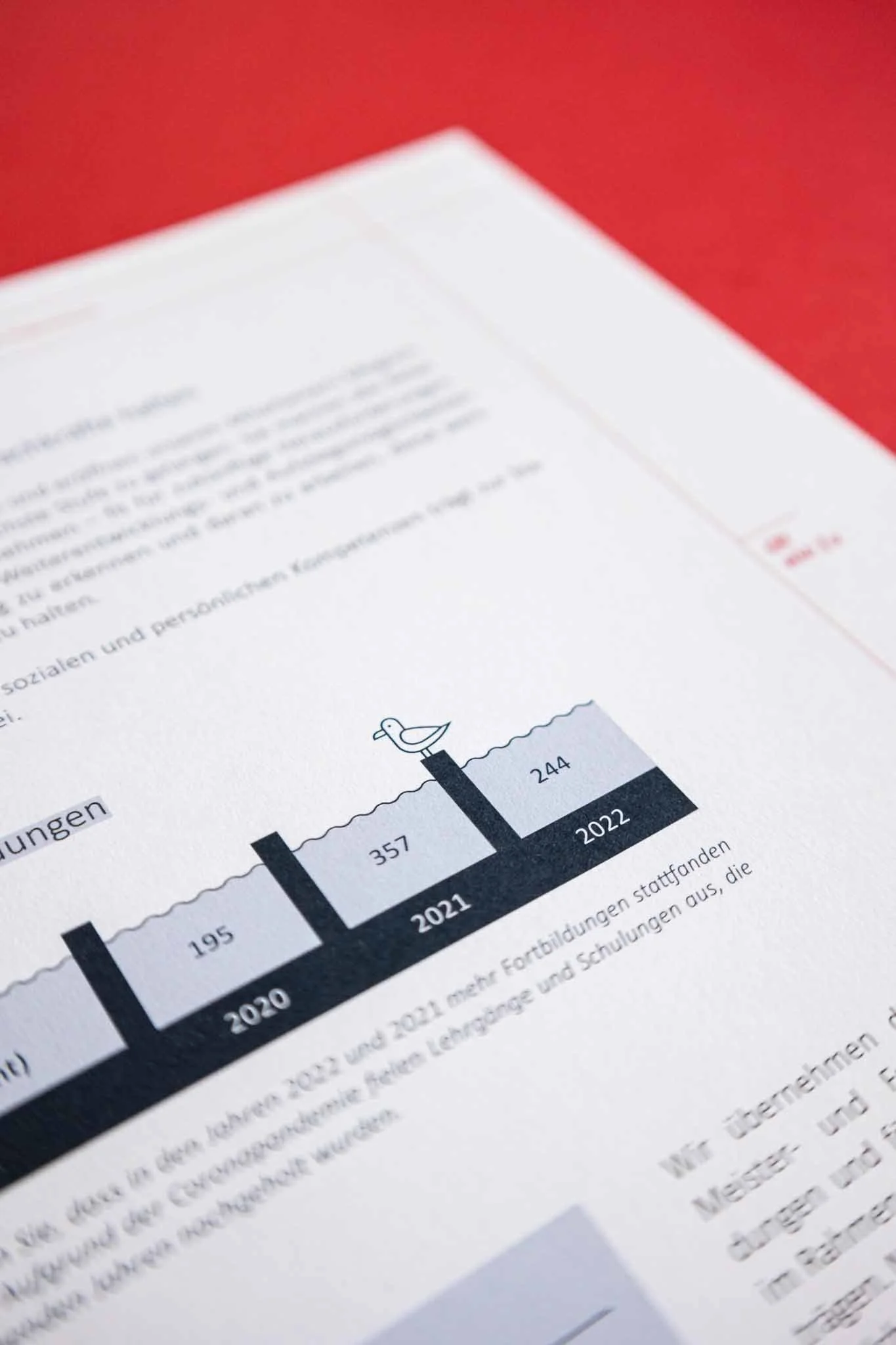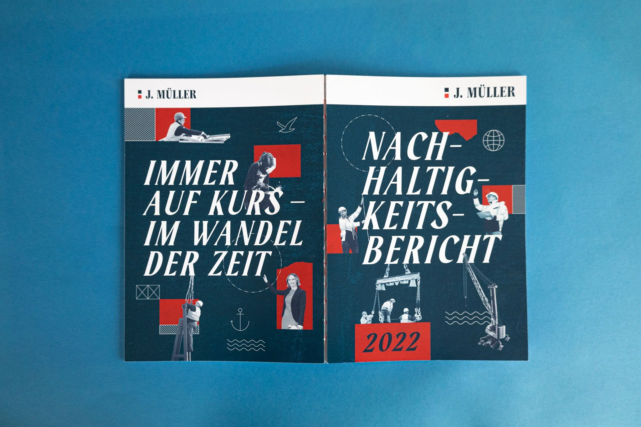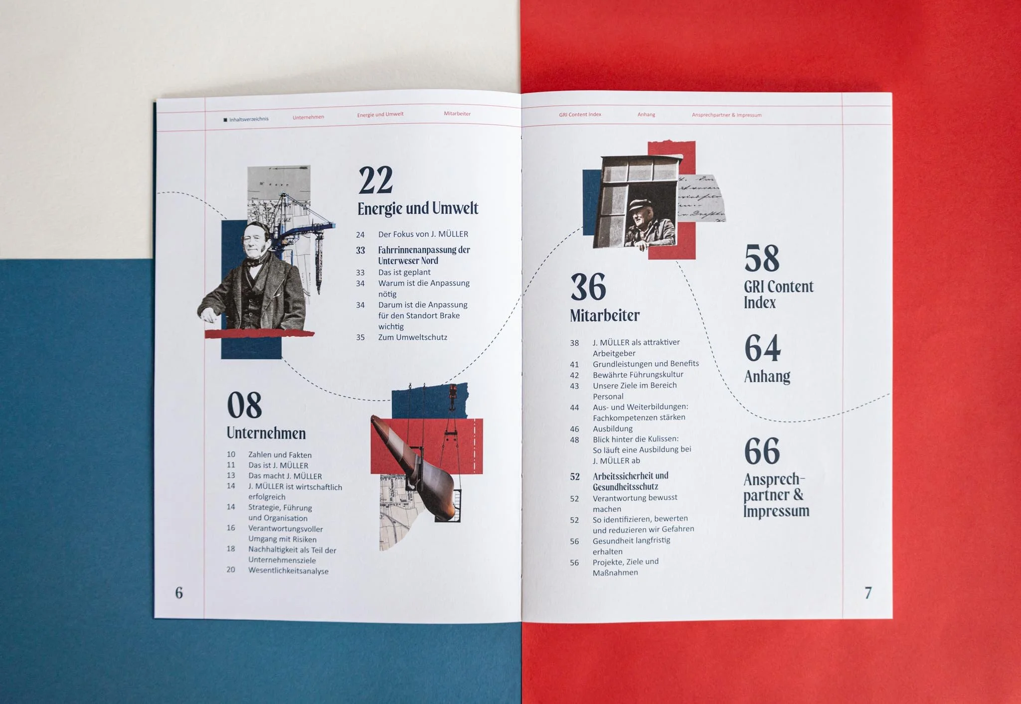 Passend zum Unternehmen haben wir einen Bericht entwickelt, der Leser*innen auf Kurs hält und durch die verschiedenen Themen lotst. Ein roter Faden und ein Rubriken-Kompass führen durch den Bericht und geben Orientierung. Die offene Fadenheftung verleiht ihm etwas Handgemachtes – fast wie ein Logbuch. Illustrationen und Collagen aus neuen und alten Bildern geben Persönlichkeit und zeigen die Menschen, die J. MÜLLER im Laufe der 200 Jahre aufgebaut haben.